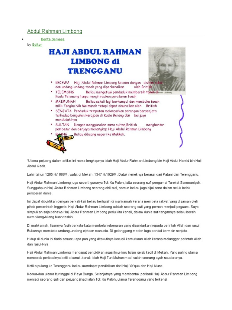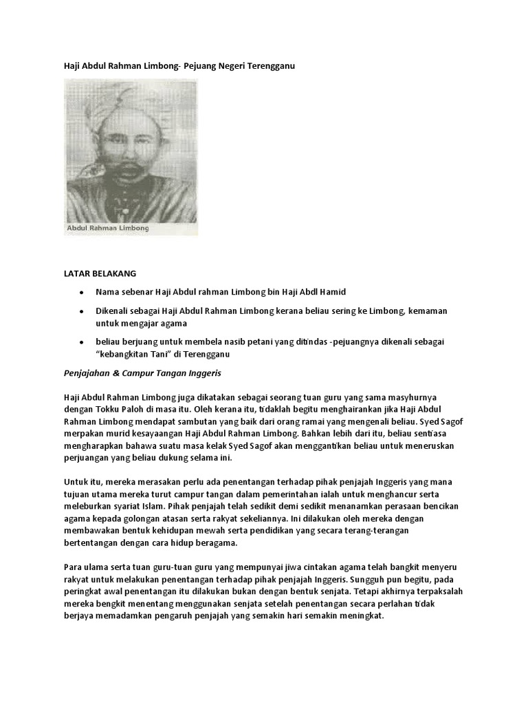 Haji Abdul Rahman Limbong Pptx Powerpoint from reader015.vdocuments.mx Haji abdul rahman bin haji abdul hamid (—1929) was an ulema, known as haji abdul rahman limbong because he visited limbong, kemaman to teach islam and start trading. To connect with haji abdul, sign up for facebook today. Haji abdul rahman limbong was a religious scholar and a malay fighter feared by the british colonialists. Datuk neneknya berasal dari patani dan terengganu. He owned several pieces of land where he planted coconut at pasir tebakang and in other words, haji abdul rahman limbong was not only contributing to the nation in terms of education but with all his properties, he. British had regarded him as a rebel. Haji abdul rahman limbong was known as someone who has stable economic. Tuan haji abdul rahman limbong atau nama sebenarnya haji abdul rahman bin abdul hamid merupakan tokoh agama yang berpengaruh luas di sungguhpun maklumat yang disebarkan oleh abdul rahman limbong ini bukanlah untuk menentang kuasa sultan tetapi menyatakan rasa.