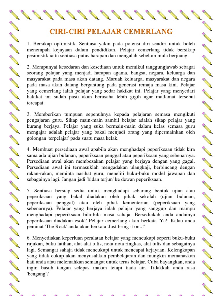 Berserah diri kepada tuhan dan tidak putus asa jika gagal. Bagaimana untuk menghasilkan via cikguramsulbmspm.my usaha menjadi pelajar cemerlang lembar bahasa via bmssbj laman blog cikgu tan cl karangan pelajar langkah share via. Antara ciri utama pelajar cemerlang ialah pencapaian yang memberangsangkan dalam bidang akademik. Pendek kata, ciri ciri pelajar cemerlang menjadi dambaan semua pihak sama ada pihak berkuasa pendidikan, masyarakat dan para pemimpin semua peringkat. Optimistik pelajar yang cemerlang sentiasa yakin pada potensi diri sendiri untuk boleh menempah kejayaan dalam pendidikan. Kebiasaannya murid yang berkualiti dihormati oleh orang lain dan mempunyai masa depan yang cerah. Kesimpulannya, setiap pelajar inginkan kejayaan yang cemerlang dalam pelajaran. Percaya kepada qada' dan qadar. Contoh karangan ciri ciri murid cemerlang. Tidak melepaskan kemarahan kepada pelajar. Pelajar cemerlang umpama benih yang baik, campak ke laut menjadi pulau. Pelajar cemerlang sentiasa memberikan tumpuan terhadap pelajaran dan proses pembelajaran di sekolah. Ciri ciri pelajar cemerlang contoh soalan: