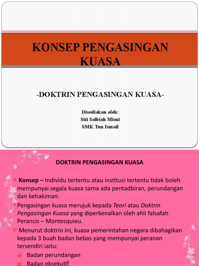 Pembahagian kuasa atau dalam bahasa inggeris dipanggil 'separation of powers merupakan satu doktrin dalam pemerintahan demokrasi yang membahagikan urusan dalam negara kepada tiga cabang utama : Teori pengasingan kuasa yang dikemukakan oleh ahli fikir perancis,montesquie. Doktrin pengasingan kuasa created using powtoon free sign up at www.powtoon.com/youtube/ create. 10 doktrin pengasingan kuasa 4 jenis kerajaan 8 demokrasi 12 sistem berpresiden dan berparlimen x > 15 pages 18 januari. Pemerintah (eksekutif), perundangan (legislatif) dan kehakiman.
